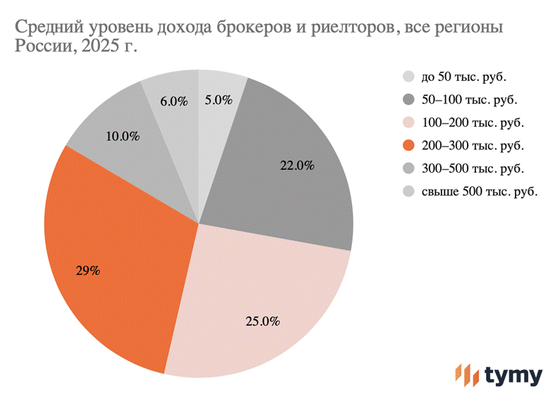 В Москве опрошенные TYMY специалисты по недвижимости в 2025 году в среднем зарабатывают 200–300 тысяч рублей. 25,8% имеют ежемесячный доход более 300 тысяч, а 29% – менее 100 тысяч рублей. За год доходы выросли у 48,4% опрошенных московских риелторов и брокеров.