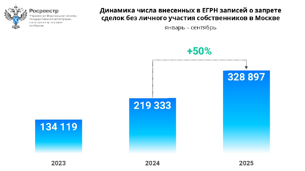 Всего в январе-сентябре 2025 года в Москве в ЕГРН внесено 328 897 записей о запрете совершать регистрационные действия без личного участия правообладателя. Это на 50% превышает результат за 9 месяцев 2024 года (219 333), а также на 145,2% больше аналогичного периода 2023 года (134 119).