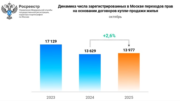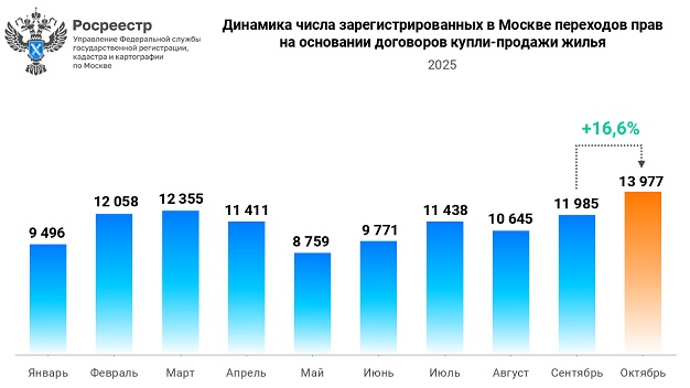 В октябре 2025 года Управлением Росреестра по Москве зарегистрировано 13 977 переходов прав на основании договоров купли-продажи жилья, что превышает результат сентября текущего года (11 985) на 16,6%.