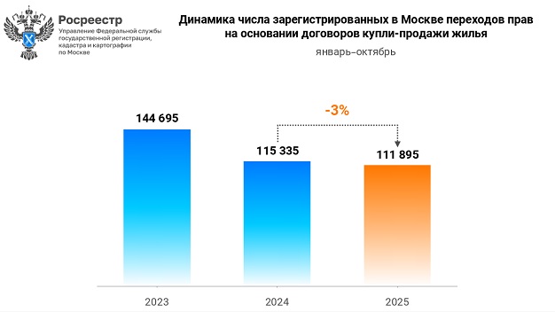 Всего за 10 месяцев 2025 года Росреестром по Москве зарегистрировано 111 895 переходов прав по договорам купли-продажи жилья. Данный показатель уменьшился почти на 3% к январю–октябрю 2024 года (115 335), а также на 22,7% к аналогичному периоду 2023 года (144 695).