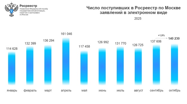 В октябре 2025 года Росреестром по Москве принято 140230 заявлений в электронном виде на регистрацию прав и постановку на кадастровый учет объектов недвижимости. К предыдущему месяцу (137 606) показатель вырос на 1,9%, а в годовом выражении число принятых электронных заявлений сопоставимо с октябрем 2024 года (140 116, +0,1%).