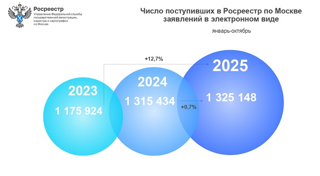 В январе-октябре 2025 года в Управление поступило 1325148 электронных заявлений. За год показатель вырос на 0,7% — за 10 месяцев 2024 года их число составило 1315434. По сравнению с январем-октябрем 2023 года (1175924) число принятых заявлений также выросло на 12,7%.