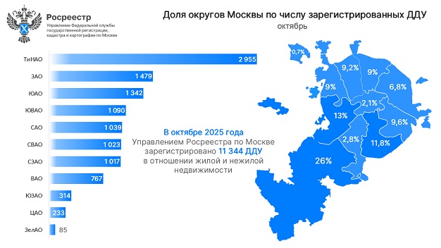 В октябре 2025 года в столице зарегистрировано 11 344 договора участия в долевом строительстве в отношении жилой и нежилой недвижимости. При этом 26% ДДУ оформлено в Новой Москве — 2 955 договоров.