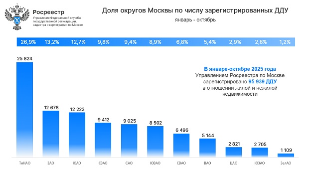 Всего за 10 месяцев 2025 года в столице зарегистрировано95 939 ДДУ, из которых 26,9% оформлено в Новой Москве (25 824 ДДУ). Западный и Южный административные округа в сумме стабильно составляют более четверти первичных договоров – 12 678 и 12 223 ДДУ соответственно.
