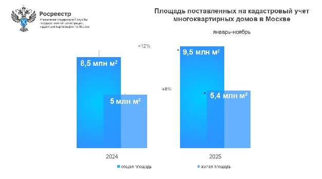 «В Москве проактивными темпами возводится комфортное жилье в современных городских кварталах. Так, общая площадь учтенных с начала года многоквартирных домов достигла 9,5 млн кв. м, что на 12% больше января-ноября прошлого года (8,5 млн кв. м). При этом увеличилась на 8% жилая площадь, с 5 млн кв. м в 2024 году до 5,5 млн кв. м», — прокомментировал Игорь Майданов.