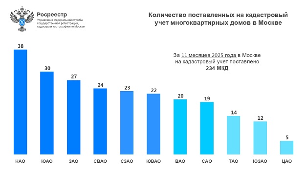 За 11 месяцев 2025 года в Единый государственный реестр недвижимости (ЕГРН) внесены сведения о постановке на кадастровый учет 234 многоквартирных домов, что на 12% больше, чем за аналогичный период прошлого года (186 МКД). Об этом сообщил руководитель Управления Росреестра по Москве Игорь Майданов.