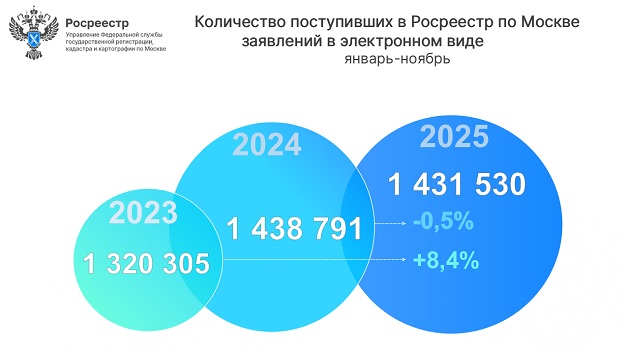 За 11 месяцев 2025 года Управлением Росреестра по Москве принято 1 431 530 заявлений в электронном виде на регистрацию прав и постановку на кадастровый учет объектов недвижимости. В годовом выражении показатель сопоставим с аналогичным периодом 2024 года (1 438 791) с разницей в 7,3 тыс. заявлений (-0,5%), а к январю-ноябрю 2023 года (1 320 305) динамика составила 8,4%.