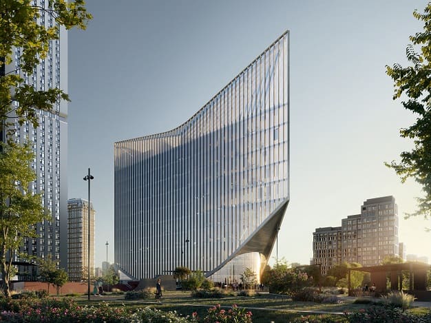 Архитектурный стиль проекта был создан знаменитым бюро UNK. Визуально офисный центр напомнит спортивную яхту: парящая форма отразит идею сохранения баланса и устойчивости — ключевых факторов стабильного бизнеса. Ярким элементом проекта станут алюминиевые вертикальные ламели, превращающие здание в оригинальную скульптуру и при этом имеющие практическое значения, оберегая окна от прямых солнечных лучей и снижая нагрузку на кондиционирование в жаркий сезон.